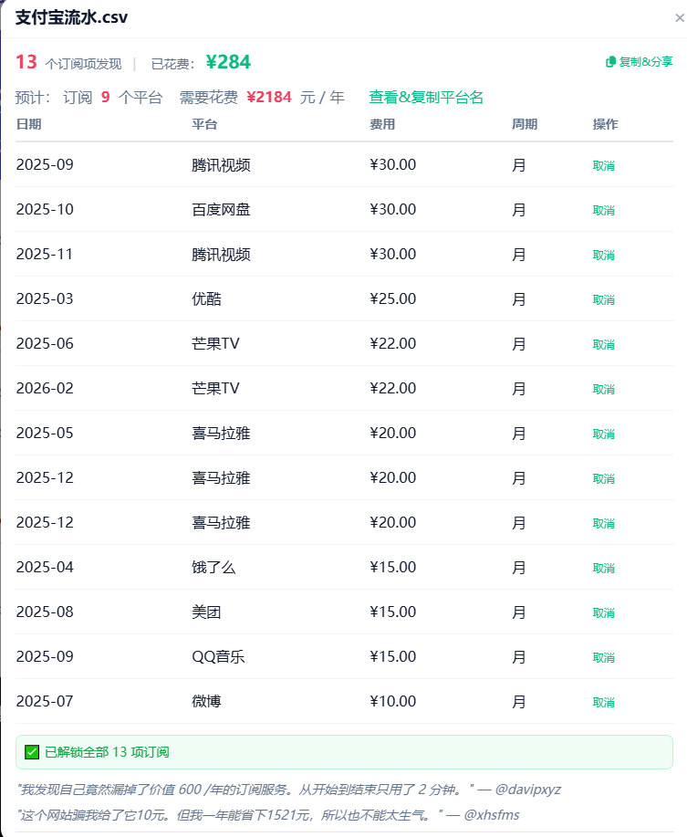 对于标准格式的流水文件,订阅识别准确率超过 92%。AI 会综合分析扣费金额、频率、平台名称等维度,尽可能减少误识别。